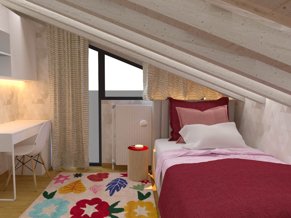 Αυτή η σοφίτα φιλοξενεί ένα κοριτσάκι και η μαμά της είχε πελαγώσει γιατί δεν μπορούσε να βρει που θα τοποθετήσει το γραφείο της μικρής αφού θα ξεκινούσε την Α δημοτικού κι έπρεπε να διαβάζει. Επιπλέον, στην προσπάθειά της να βρει ένα γραφείο που θα μπορούσε να χωρέσει σ’ ένα τόσο μικρό χώρο, είχε ξοδέψει ατελείωτες ώρες στα καταστήματα. Οι σοφίτες έχουν ένα πολύ σημαντικο περιορισμό, αυτόν του ύψους. Τελικά, μπορέσαμε να της βάλουμε γραφείο, βιβλιοθήκη, ντουλάπια και φυσικά να αλλάξουμε το κρεβάτι της με ένα μεγαλύτερο.